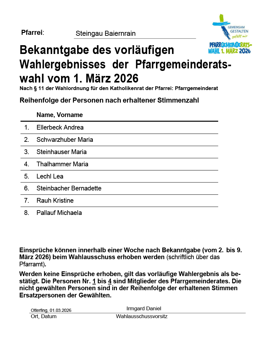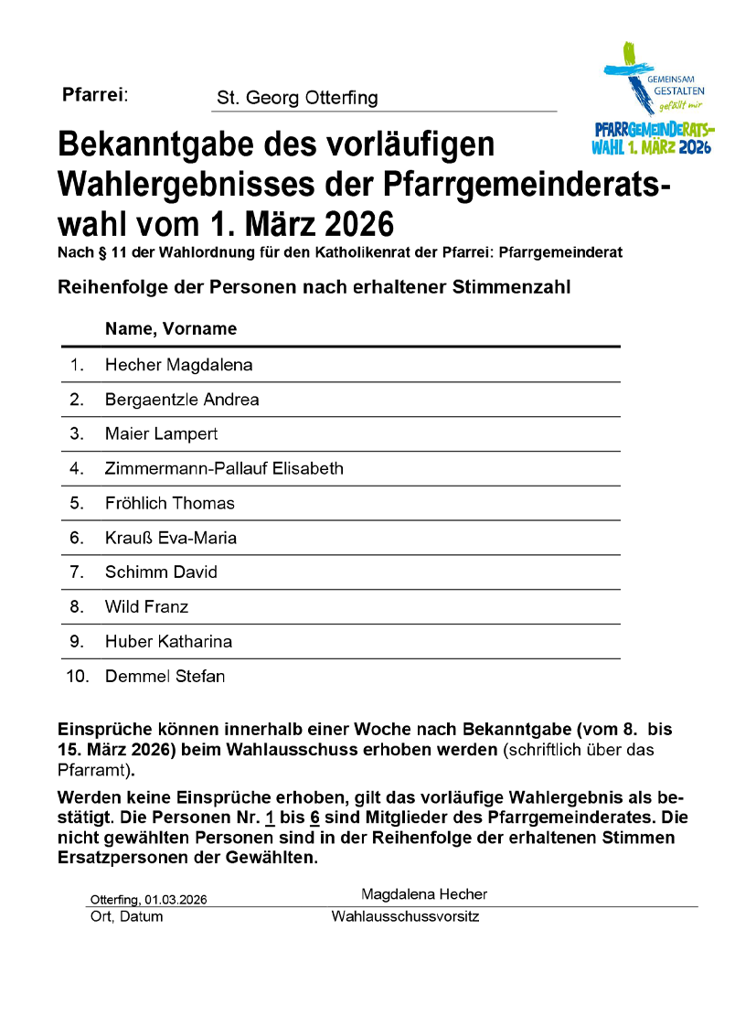 Am Sonntag, 01. März 2026, fanden die Pfarrgemeinderatswahlen statt. Das Motto lautet: „Gemeinsam gestalten. Gefällt mir".